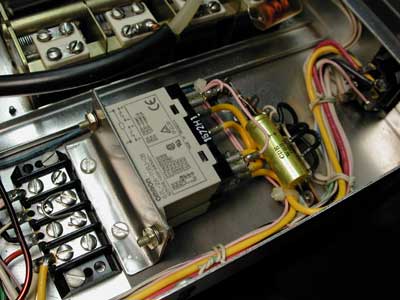 An Omron (PN G7L-2A-TUBJ-CB) 220VAC coil type relay with four 25Amp rated working contacts, slaved off the power switch will now handle the power switching (see wiring diagram). Luckily there is adequate room to mount it in a perfectly logical place right next to the filament transformer, using the existing hardware of the plate tuning coilform. Handy! Mounted on a custom little 304SS bracket (nothin' but the best for the girls I go with!) ...and no new holes required !