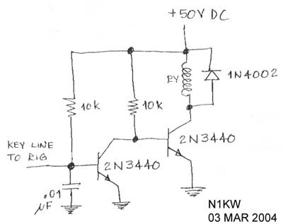 A new RCA jack was located next to, and paralleled with the original Key connector (yes, I drilled two new holes into the panel!). All new components were installed on an adjacent terminal strip. A free wheeling diode was added across the key relay to snub the turn-off spike and keep the transistor from going to the happy hunting ground. This upgrade makes the keying input fully compatible with the Icom 756, and any other exciter out there, including the connectors...nice! A standard RCA to RCA cable can now be used to link the exciter to the amp. The circuit worked first time...every time!