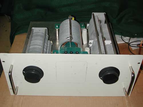 under construction). Built of larger components, including verniers on primary and secondary capacitors. Note homemade primary coil (of 6 gauge solid copper) on G10 form within commercial secondary coil. Unit is to incorporate Daiwa type 103 dual meter for SWR indication. ![]() |