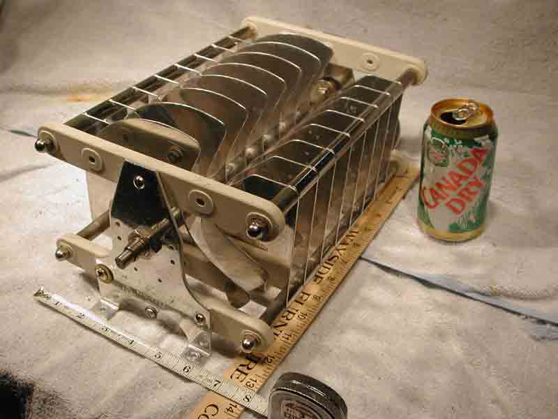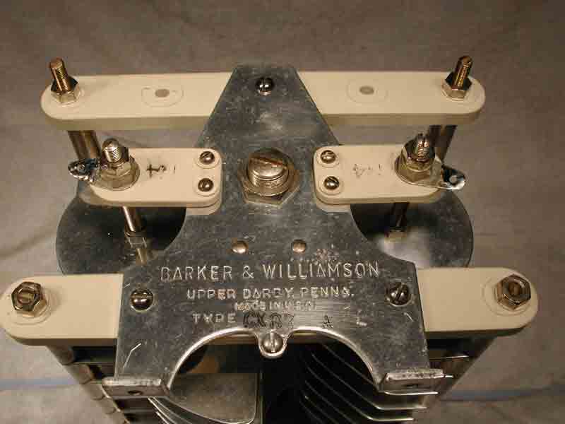 Barker&Williamson balanced dual Section (Mother of all) Variable capacitors. Dimensions as seen in pix, ??pFarads, 3/8 shaft dia., condition very good, aluminum is predominantly bright and shiny with a few slightly cloudy spots the size of a pencil eraser, no evidence of arcing or broken porcelains, (2) screw adjustable (neutralizing?) plates. $80